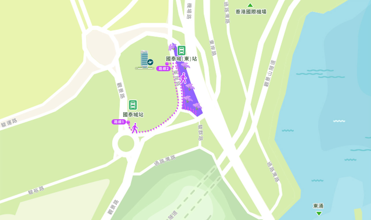 乘搭往機場方向E線巴士,於國泰城或國泰城(東)巴士站下車,然後向香港國際機場古物園方向,沿東岸路及駿群路前行。